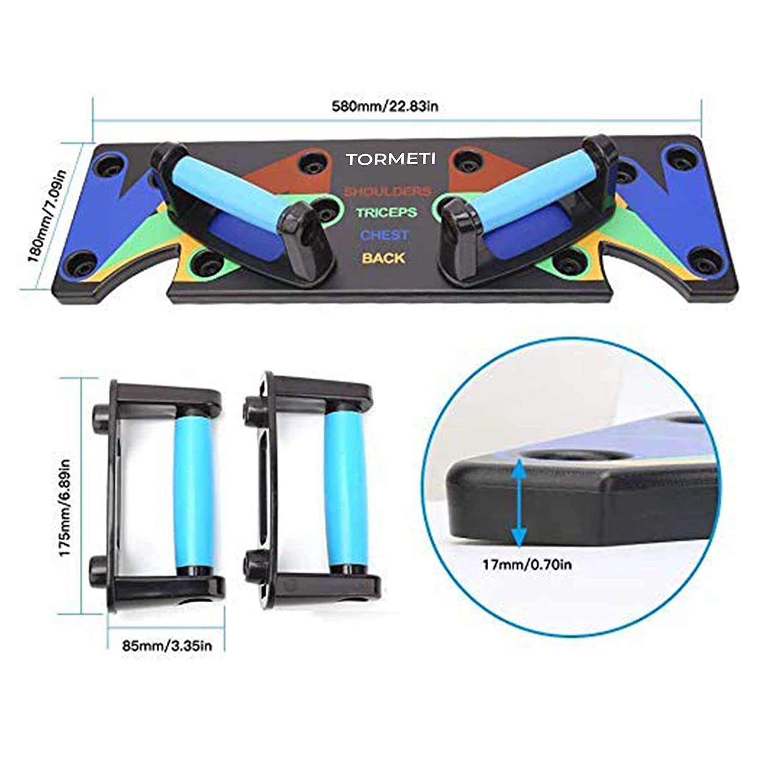 Target specific muscle groups when using 9-In-1 Pushup Board's color coded training system: Shoulders (Red), Chest (Blue), Back (Yellow), and Triceps (Green).